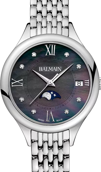 Dit is een elegant dameshorloge dat gedurfde elegantie combineert met een modern design geïnspireerd op de kunstzinnigheid van de Parijse haute couture. De zwarte parelmoer, maanfase, wijzerplaat bezet met 8 Top Wesselton VS-SI-diamanten, voor een totaal van 0,030 karaat wijzerplaat en klassieke Romeinse cijfers voegen een levendige, elegante toets toe, terwijl de 31 mm roestvrijstalen kast, met een slanke dikte van 7,65 mm en roestvrijstalen band, dagelijkse verfijning biedt. Dit uurwerk is Swiss Made en heeft een saffierkristalglas.
