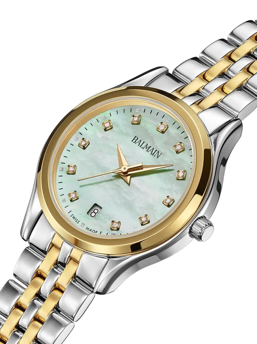 Dit tijdloze en klassieke dameshorloge heeft een wijzerplaat van groen parelmoer met diamanten index (0,041crt). Naast de tijd is op de wijzerplaat ook de datum af te lezen. De kast -en bijpassende horlogeband zijn vervaardigd van edelstaal en deels voorzien van een gele PVD-coating. De B8342.39 76 is uitgerust met een quartz uurwerk, heeft een krasbestendig saffierglas en is tot 50 meter waterdicht. Het bicolor model heeft een diameter van 27,5 millimeter. Dankzij de verfijnde en luxe details is dit Balmain dameshorloge B83423976 uit de Beleganza serie echt een prachtig horloge voor stijlvolle dames.