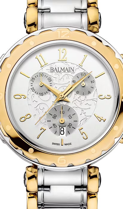 het Balmain Balmania Horloge B56323913 is voorzien van Zwitsers quartz-uurwerk, datumfunctie en chrono multi-indicatie. Met een edelstalen kast en band in goud-zilver combinatie, een ronde witte wijzerplaat met Arabische index en saffierglas. waterdicht tot 5 ATM. Ideaal voor dagelijks gebruik en formele gelegenheden.