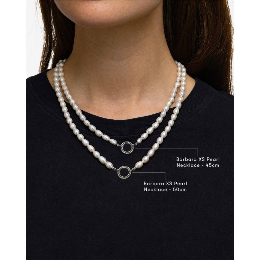 Maak kennis met de Zilveren Barbara XS Parel Ketting 45cm. Een vernieuwde versie van de populaire Barbara Mini Parel ketting, maar dan met twee keer zo veel zoetwaterparels! Je bevestigt deze prachtige ketting door middel van een ronde Barbara sluiting die maximaal 3 hangers kan dragen. Ontworpen in Amsterdam en handgemaakt in Zuid-Oost Azië van gerecycled zilver. Let er op dat de zoetwaterparels kwetsbaar zijn en vragen om een zorgvuldige behandeling. Vermijd contact met water, parfum of cosmetica, en bewaar ze bij voorkeur apart van andere sieraden om krassen te voorkomen. Uniek, elegant en spraakmakend. Met deze ketting straal jij in ieder gezelschap. Hoe ga jij deze Zilveren Barbara XS Parel Ketting dragen?