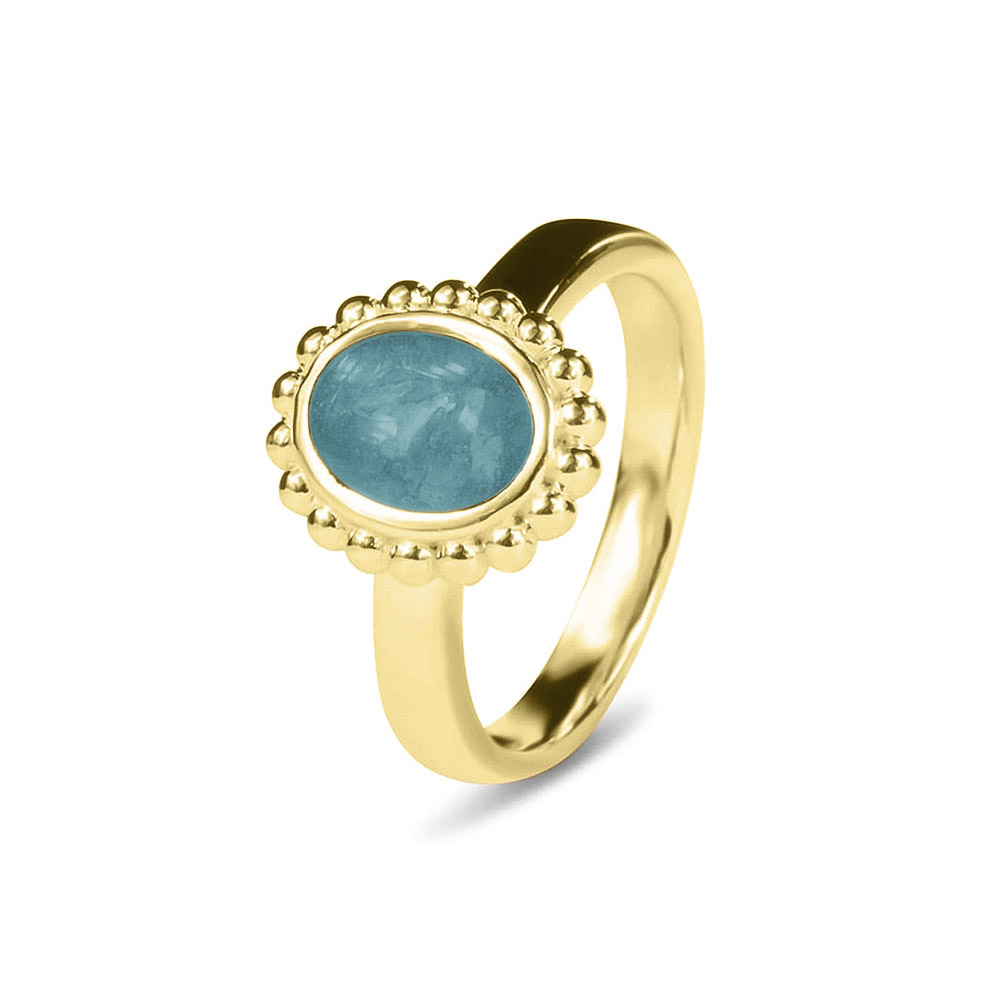 Ovale parelrand ring. Dit sieraad wordt zichtbaar aan de bovenkant gevuld met as en wordt vermengd met onze speciale hars. Deze ring kan mooi gecombineerd worden met de bijpassende hanger, 132