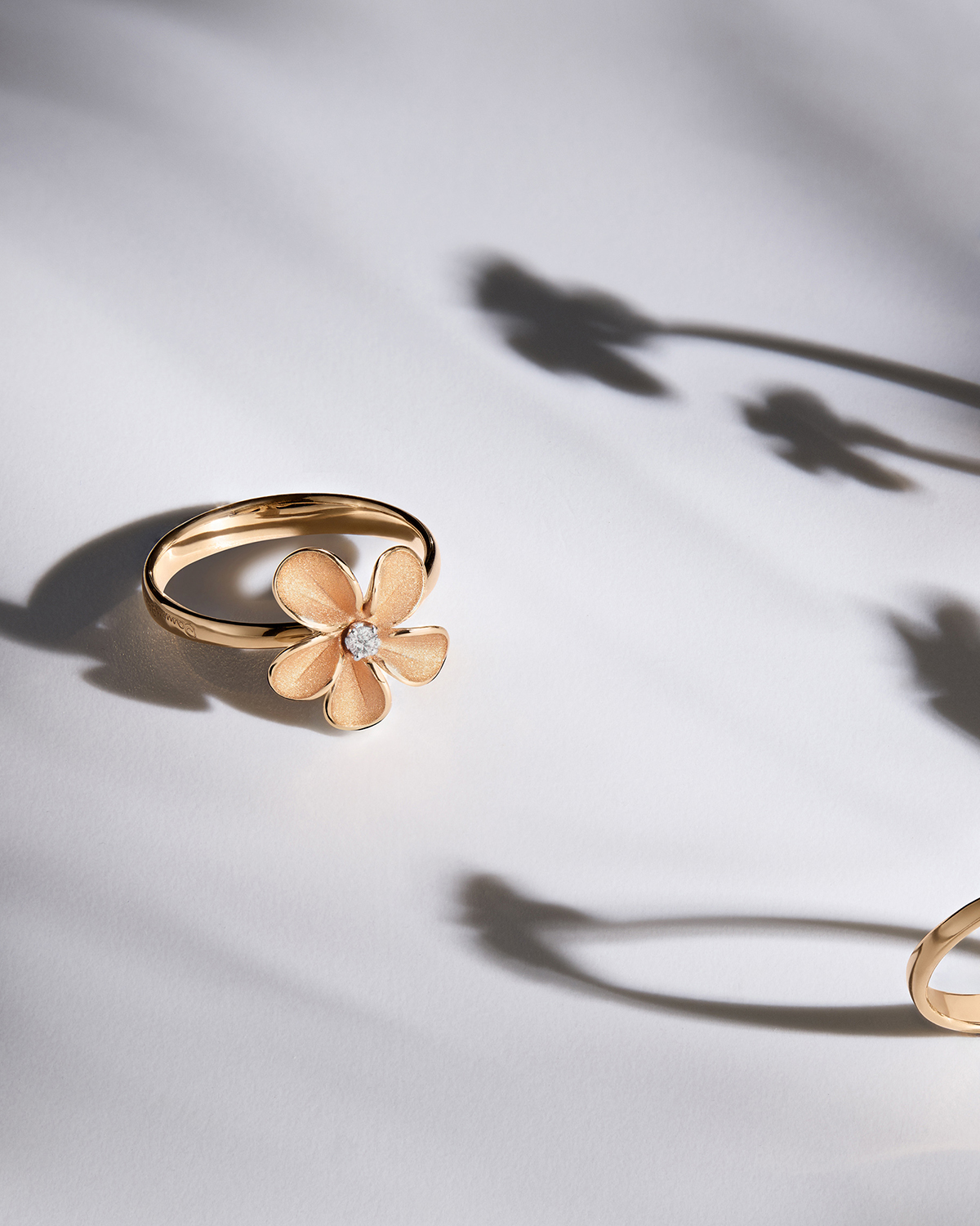 Cherry Bloom vangt de gratie en lichtheid van kersenbloesems in de lente en viert de tijdloze savoir-faire van het Maison op het gebied van bloemenvakmanschap. Met zijn speelse maar delicate allure belichaamt deze collectie veelzijdigheid en dynamiek, in de kenmerkende stijl van Cammilli. De satijnen Aetherna-afwerking streelt zachtjes het oppervlak als licht dat door bloemblaadjes valt, terwijl de gepolijste rand de driedimensionale elegantie accentueert. Cherry Bloom is ook verkrijgbaar in een versie die is verbeterd met een met diamanten bezet profiel en voegt een vleugje verfijnde helderheid toe aan degenen die het dragen.