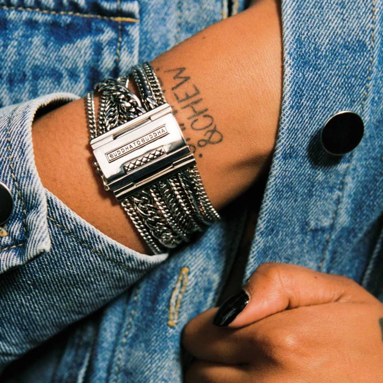 Buddha To Buddha  925 sterling 7 delig brede zilveren fantasie schakelarmband met baksluiting en veiligheidsachtje. Model: 124-Multi Chain Nathalie-in lengte -E en dat is 19 cm