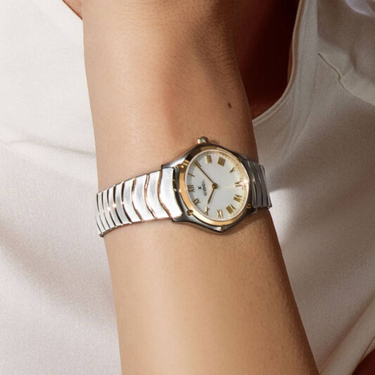 Het Sport Classic dameshorloge van Ebel is een klassiek model. Het horloge heeft een Zwitsers quartz uurwerk dat geplaatst is in een edelstalen kast met 18krt gouden lunette. De wijzerplaat is gemaakt van parelmoer en heeft Romeinse cijfers.  Aan de kast zit de bekende Ebel Wave schakelarmband met een vlindersluiting.