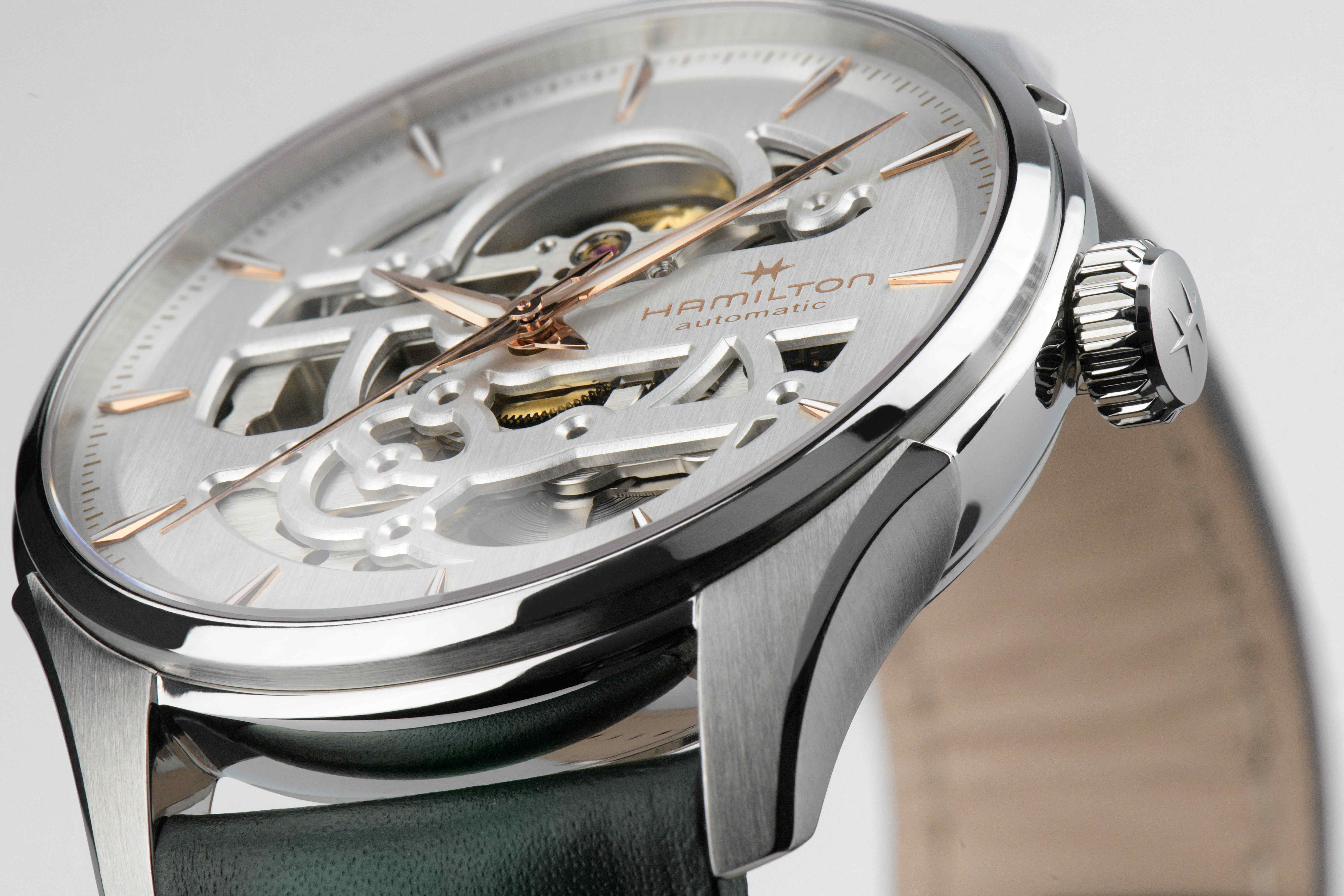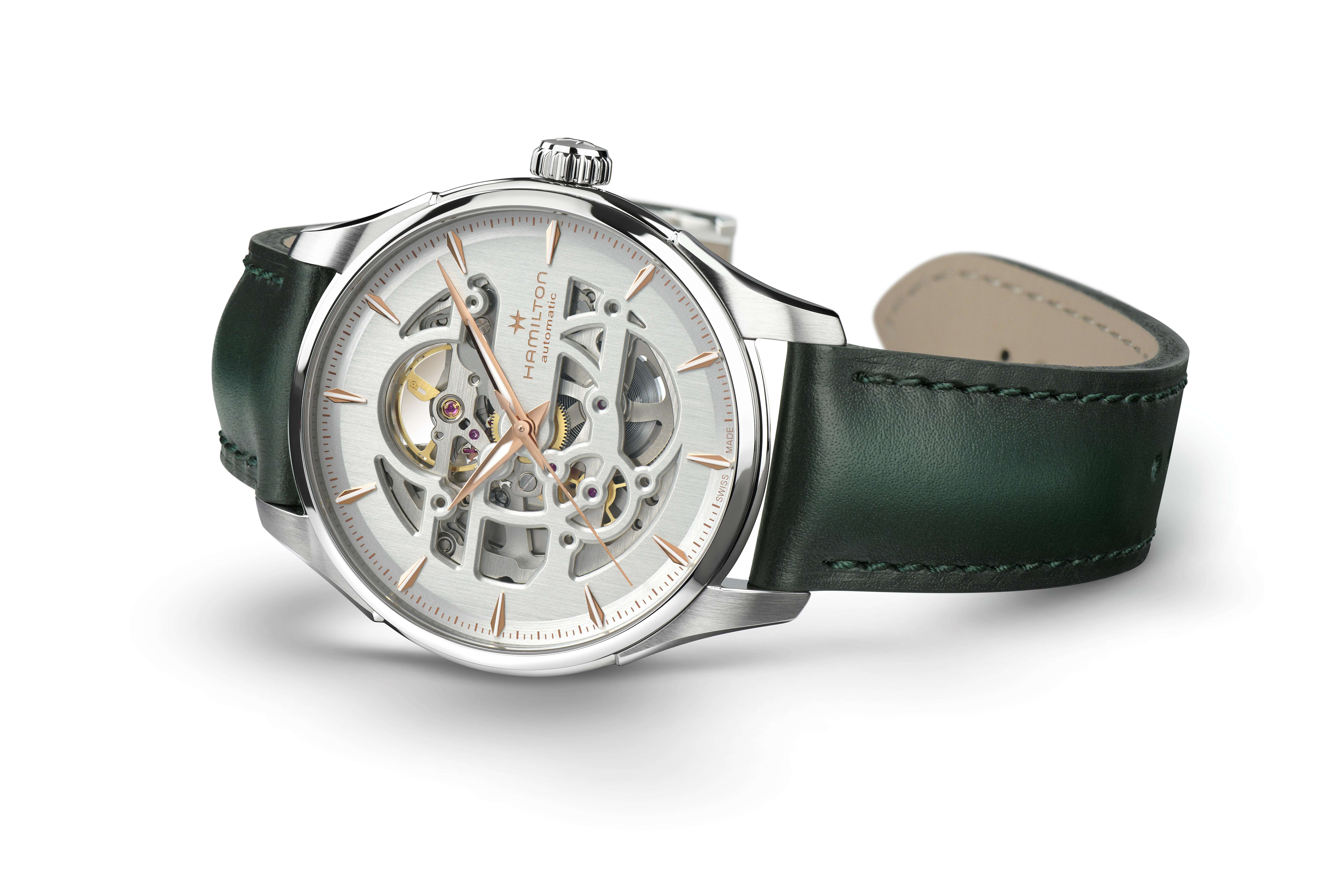De 40mm Jazzmaster Skeleton met zilveren uitgesneden wijzerplaat legt het accent op precisie en biedt een blik op de subtiele schoonheid van de techniek van het uurwerk binnenin. De Jazzmaster Skeleton zet het H-10-S automatische uurwerk in de kijker, met een gangreserve van 80 uur en een balansveer van Nivachron™. De verfijnde groen lederen band benadrukt het vakmanschap en de aandacht voor detail van Hamilton.