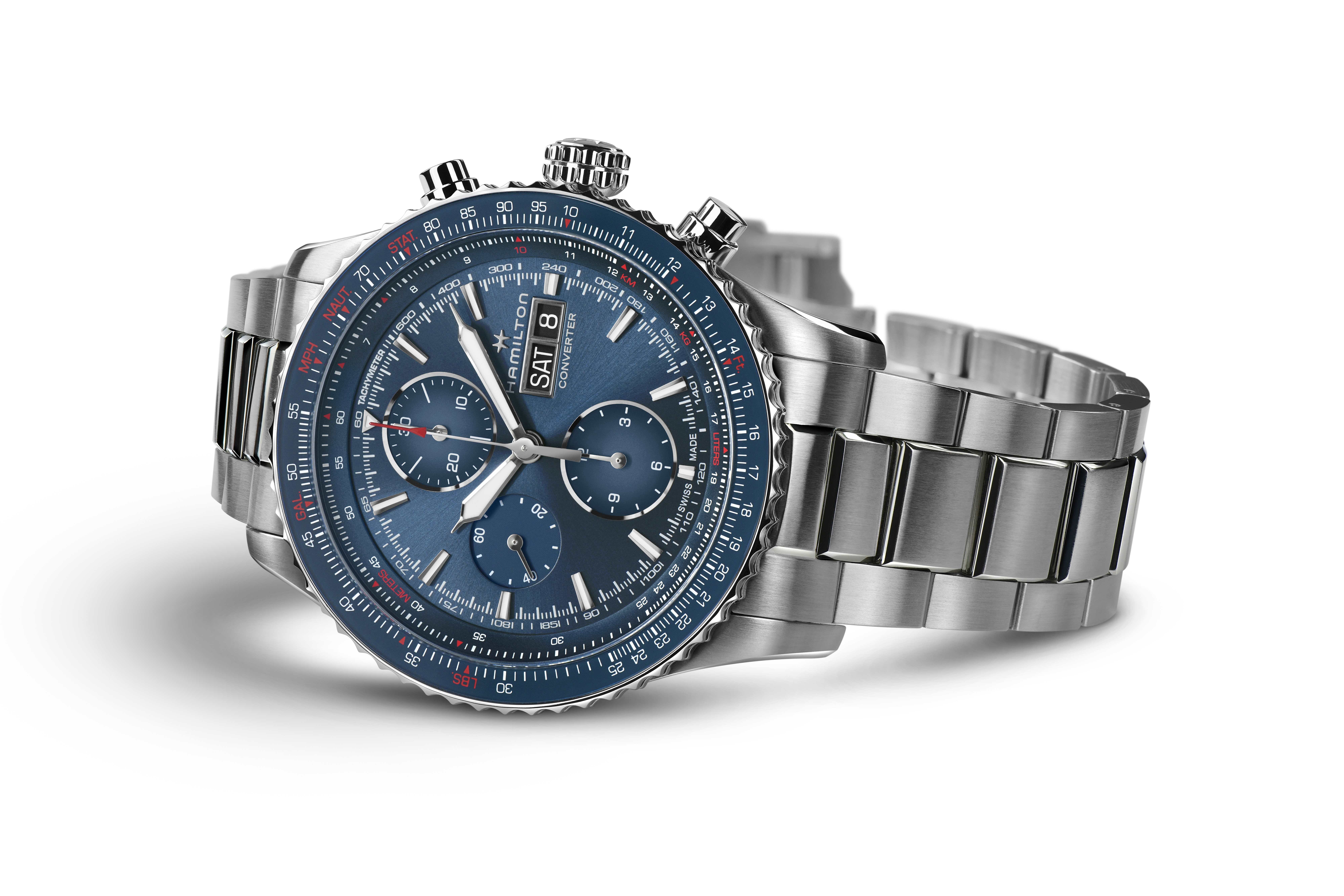 Navigeer door het luchtruim met onze Khaki Aviation Converter Auto Chrono, uitgerust met een in twee richtingen draaiende rekenliniaal voor snel om- en uitrekenen. Dit pilotenhorloge, dat is voorzien van het H-21-Si uurwerk met een silicium balansveer voor uitstekende prestaties en nauwkeurigheid, weet functionaliteit en een luchtvaartuitstraling op perfecte wijze te combineren: de roestvrijstalen kast roept samen met een roestvrijstalen armband en een blauwe wijzerplaat beelden op van een strakke, helderblauwe hemel.