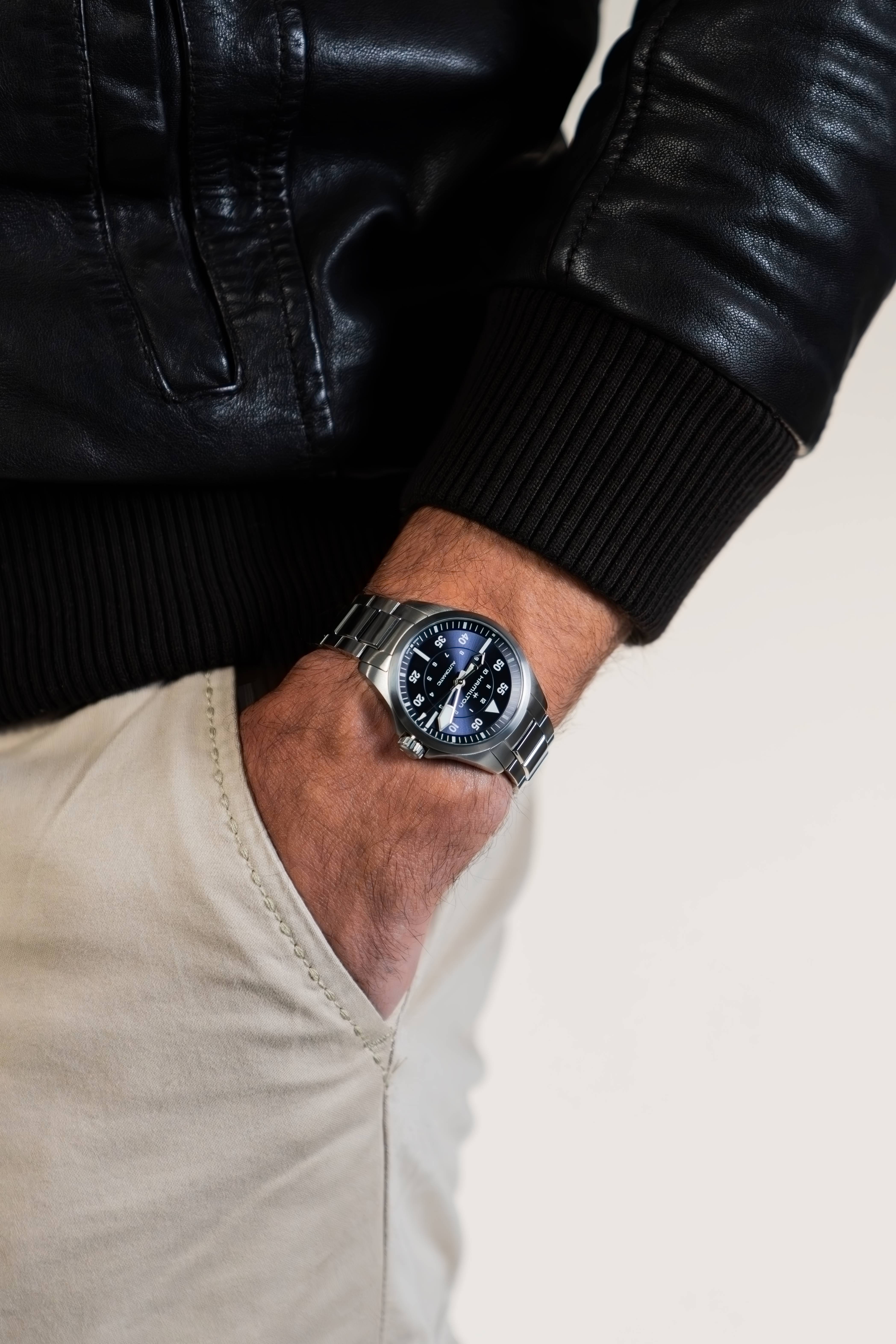 De Khaki Pilot Auto is speciaal ontworpen met het oog op ware luchtvaartliefhebbers, als een herinnering aan het verkennende en avontuurlijke karakter van de Khaki. De 36 mm-versies, aangedreven door het H-10 automatische uurwerk met een gangreserve van 80 uur en een Nivachron™-balansveer, sluiten aan bij de trend van kleinere horloges. Hoewel ze voldoen aan de eisen op het gebied van precisie voor de cockpit, lenen deze compactere ontwerpen zich perfect voor het leven in de lucht én op het vasteland. De Khaki Pilot Auto combineert een tijdloze roestvrijstalen band met een nachtblauwe wijzerplaat en een speciale Super-LumiNova-coating voor betere afleesbaarheid.