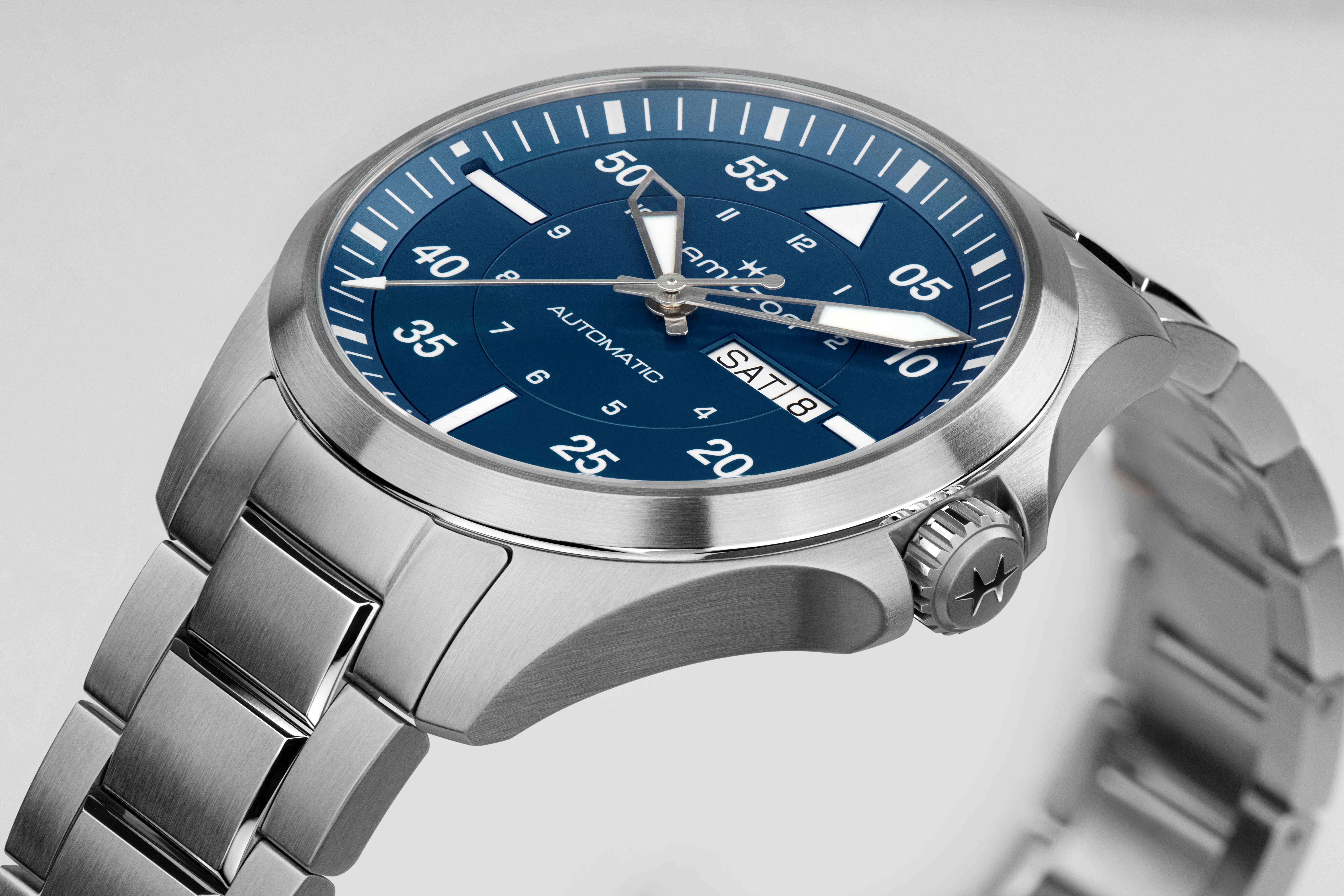 De Khaki Aviation Pilot Day Date is speciaal ontworpen met het oog op ware luchtvaartliefhebbers, als een herinnering aan het verkennende en avontuurlijke karakter van de Khaki. Dit model wordt aangedreven door het H-30 automatische uurwerk met een gangreserve van 80 uur en een Nivachron™-balansveer. Het heeft een dag-datumaanduiding en vergrote cijfers op de wijzerplaat voor een betere afleesbaarheid. De Khaki Aviation Day Date 42 mm is voorzien van een stoere roestvrijstalen horlogeband en een intens blauwe wijzerplaat die de grenzeloze mogelijkheden van een heldere, uitgestrekte lucht oproept.