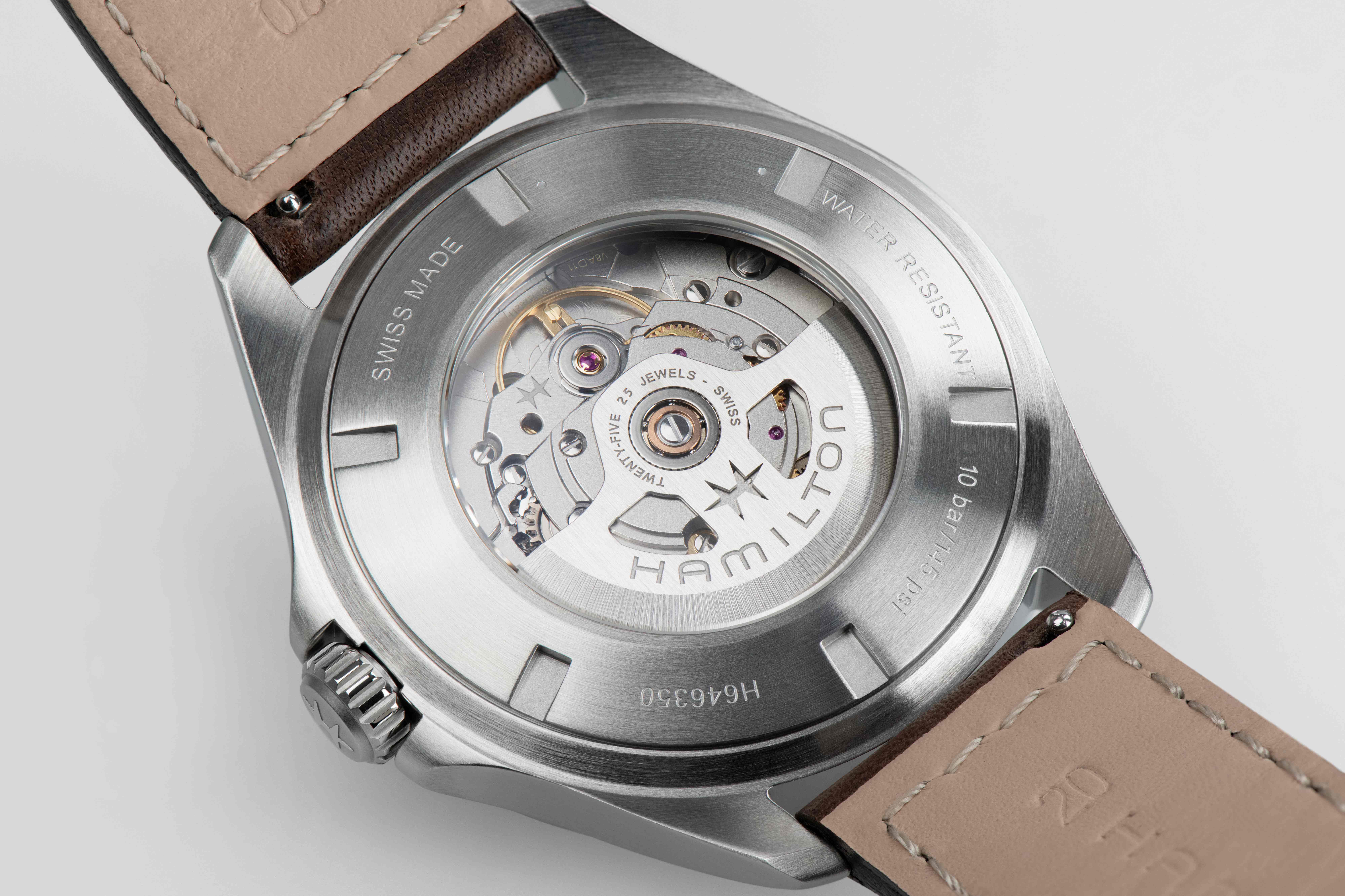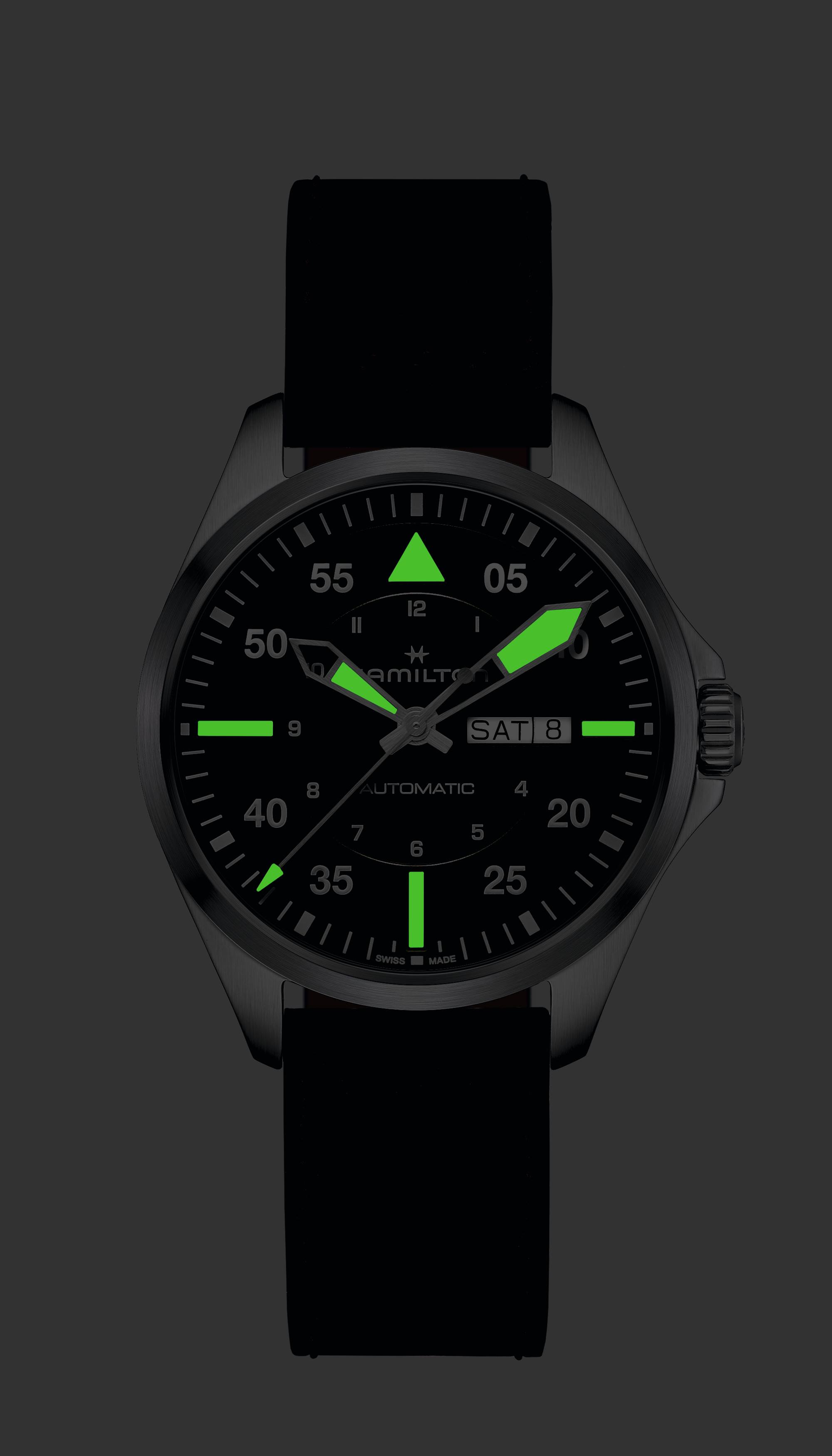 De Khaki Aviation Pilot Day Date is speciaal ontworpen met het oog op ware luchtvaartliefhebbers, als een herinnering aan het verkennende en avontuurlijke karakter van de Khaki. Dit model wordt aangedreven door het H-30 automatische uurwerk met een gangreserve van 80 uur en een Nivachron™-balansveer. Het heeft een dag-datumaanduiding en vergrote cijfers op de wijzerplaat voor een betere afleesbaarheid. De Khaki Aviation Day Date 42 mm combineert een donkerbruine leren band met een olijfgroene wijzerplaat, als eerbetoon aan de avontuurlijke outdoorroots van de Khaki.