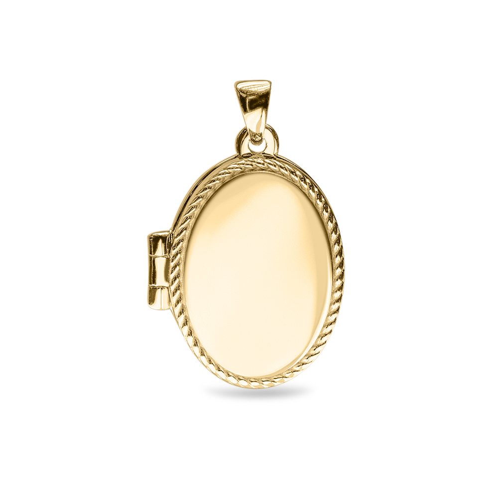 Ovaal medaillon met getorst randje. Dit medaillon is zeer geschikt voor de verwerking van zowel as, haar, foto en een gravure, zoals een vingerafdruk.