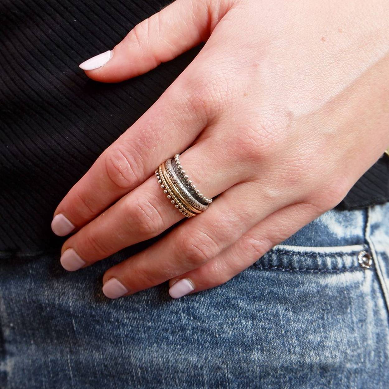 Ring van de najaarscollectie 2022 van Jéh Jewels gemaakt van geoxideerd zilver, en goldfilled. Deze lieve ring heeft, net als vele van onze ringen, goldfilled bandjes die in het midden kunnen draaien. De bolletjes aan de zijkant maken deze ring extra leuk!