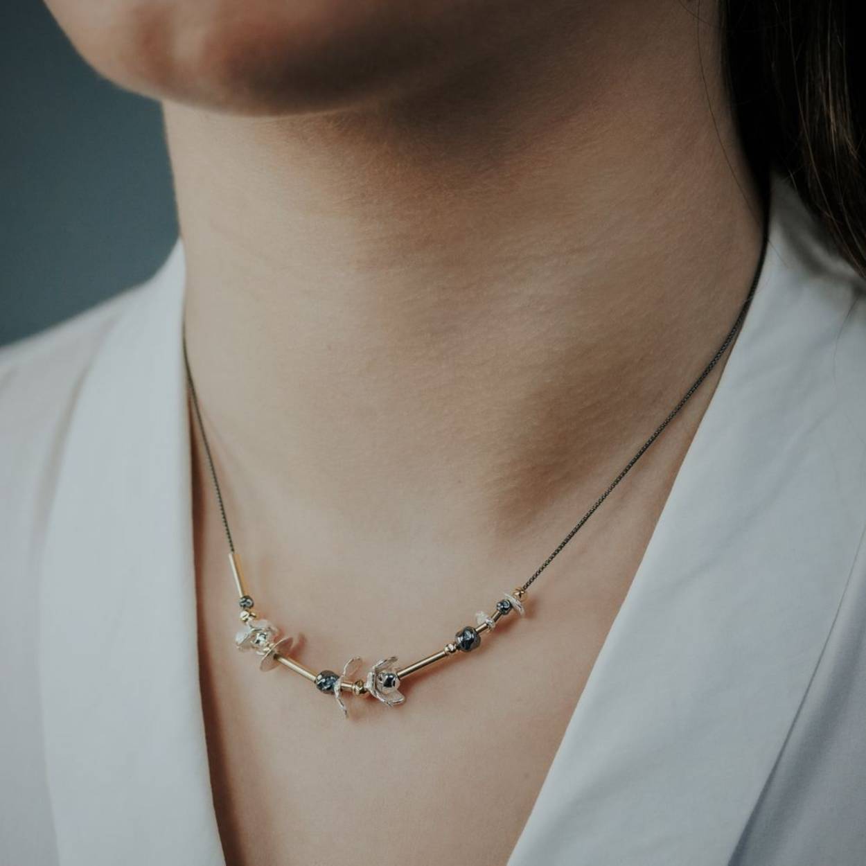 Collier met buisjes, balletjes en bloemetjes. Gemaakt van 925 (geoxideerd) sterling zilver en Goldfilled. Combineer met mooie oorsieraden, een ring en armband. Het collier is verstelbaar waardoor je hem ook op een andere lengte kunt dragen.