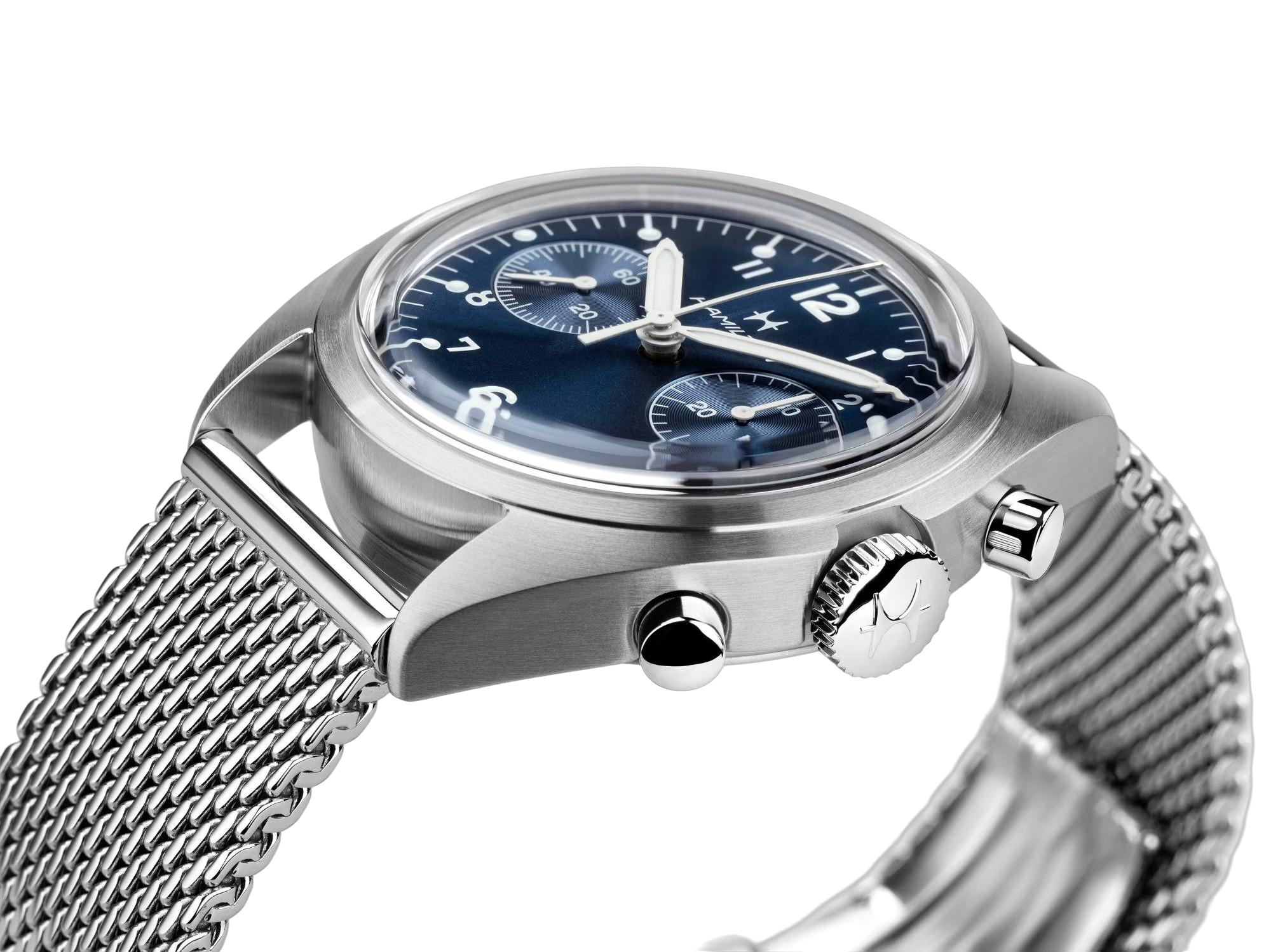 De Khaki Pilot Pioneer Mechanical Chronograph is robuust, betrouwbaar en met de opvallende vintage look van het militaire luchtvaartontwerp brengt de Khaki Pilot Pioneer de vorm en functie terug van chronografen gebruikt door de Britse Royal Air Force-piloten in de jaren 70.  Dit horloge wordt aangedreven door Hamilton's exclusieve handmatig opwindbare H-51-Si uurwerk, heeft een gangreserve van 60 uur en een prachtige wijzerplaat in de kleur Aviation Blue met een sunray finish.