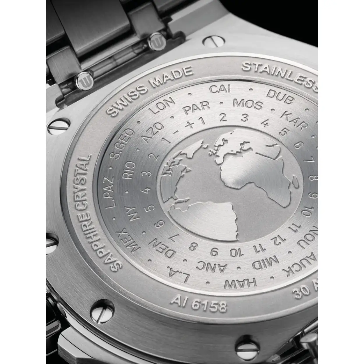 Het mechanisch uurwerk met automatische opwindfunctie biedt u datum-aanduiding, een GMT-functie (afzonderlijk in te stellen tweede tijdzone), als tijdfunctie(s). De ronde horlogekast is 300m waterdicht en voorzien van een saffierglas.