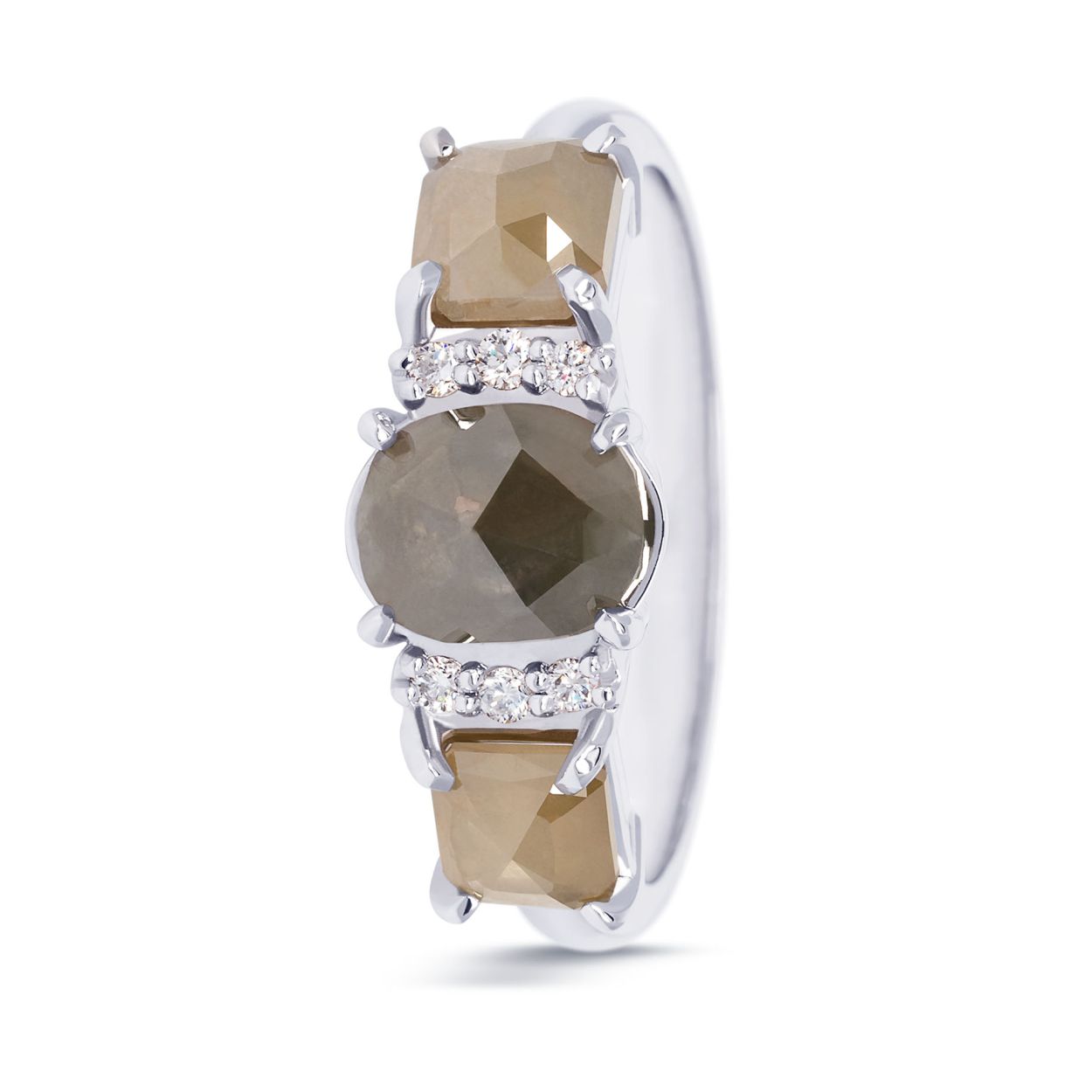 witgouden R&C ring uit de Nous collectie met 3 roosgeslepen fancy-colored diamanten totaal 1.95 Crt