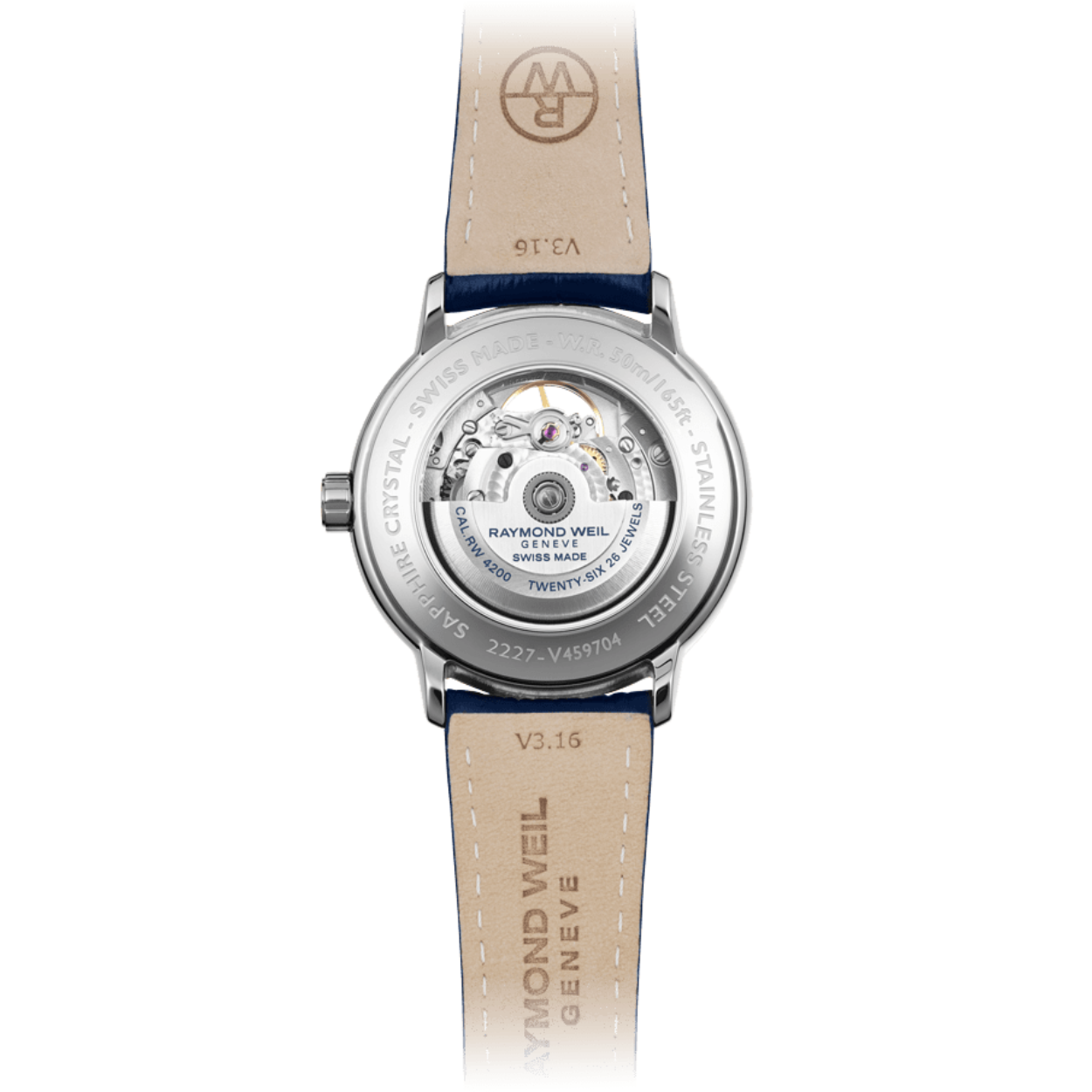 Dit herenhorloge is van het merk Raymond Weil. Het is een analoog horloge met een band gemaakt van leer.De diameter van de kast is 40 mm.