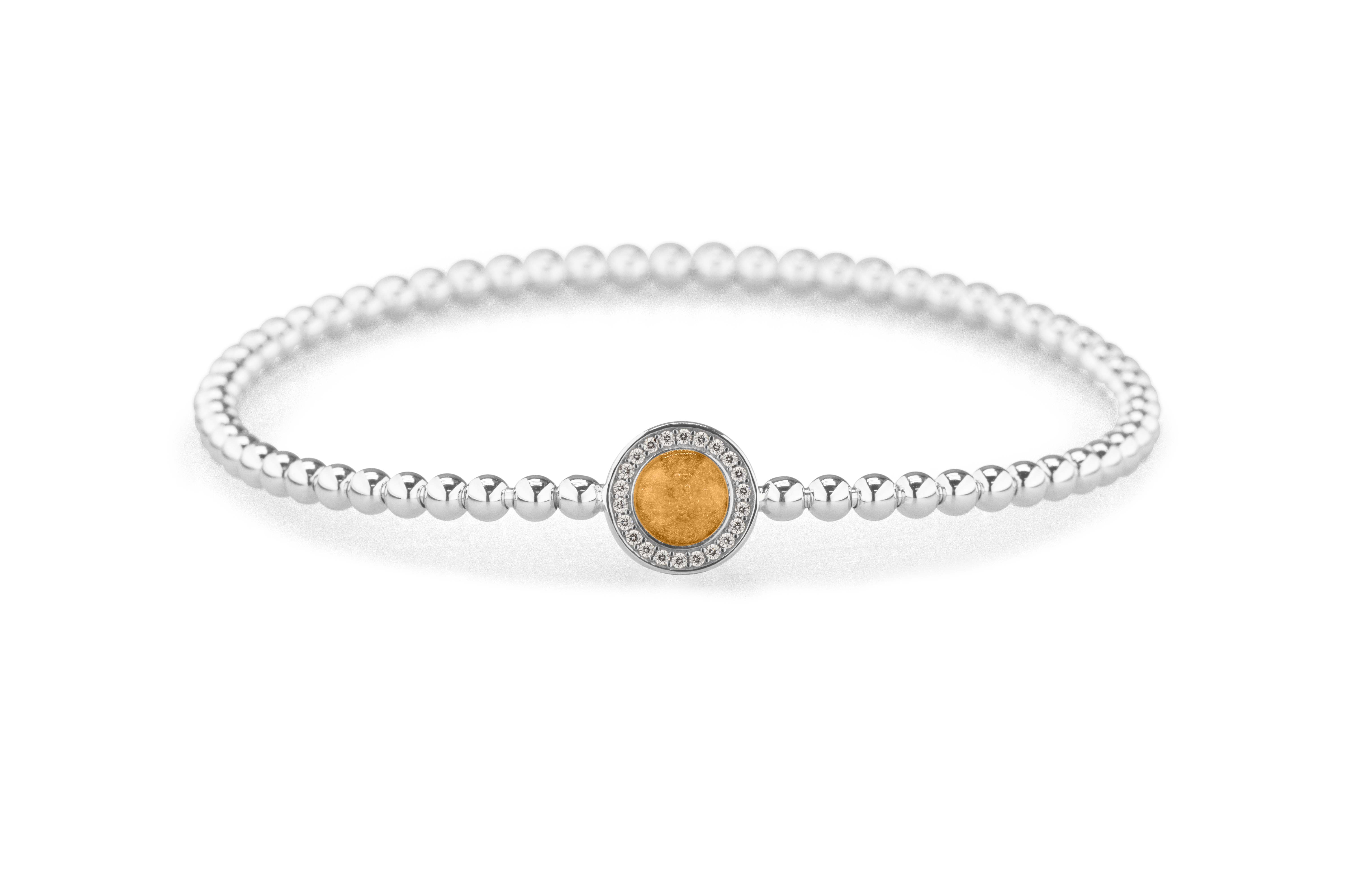 Deze flexibele bolletjes armband is bezet met diamant of zirconia. De armband is voorzien van een stalen veer (geen elastiek). De armband moet net over de hand kunnen schuiven om mooi aangesloten aan de pols te kunnen dragen. Dit sieraad wordt zichtbaar aan de voorkant gevuld met as of haar en wordt vermengd met onze speciale hars