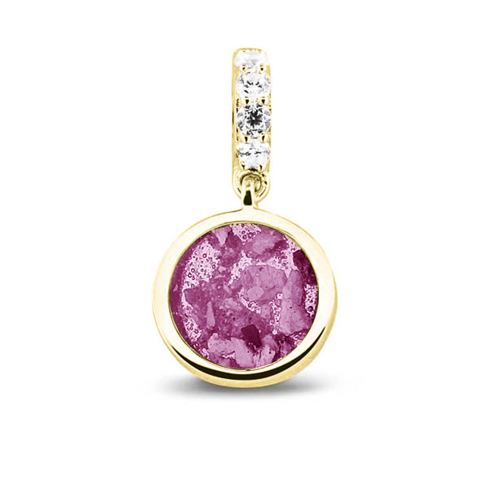 Ronde bedel hanger met Diamant of zirconia hangoog. De bedel wordt aan de voorkant gevuld met as of haar. De bedel is geschikt om aan armbanden 800 S, 811 S, 812 S of 813 S gedragen te worden. Tevens geschikt om aan een Pandora armband te dragen. Op de achterzijde is nog plek voor een gravure zoals bijvoorbeeld een naam, datum of vingerafdruk.