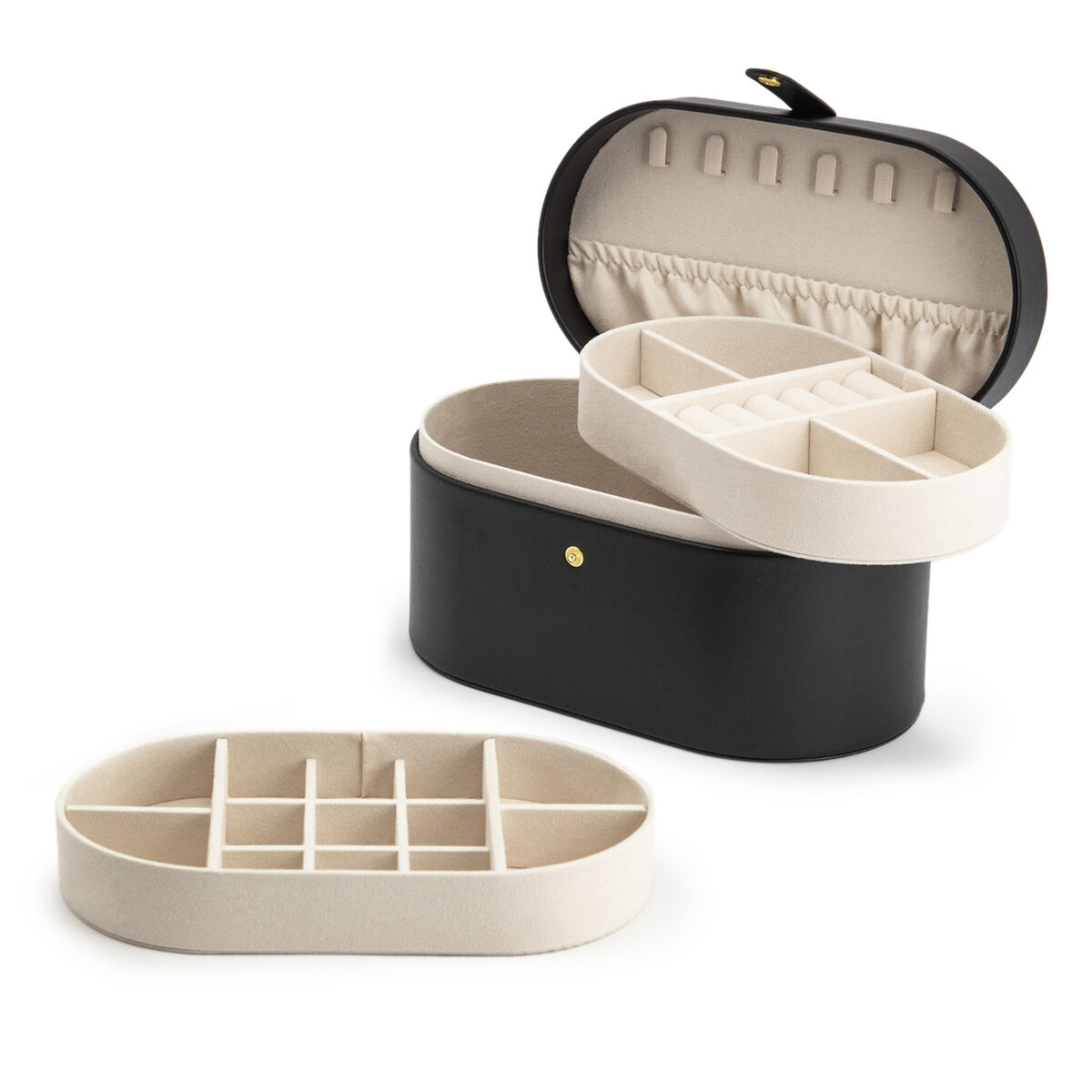 Luxe sieradenbox in de kleur zwart uitgevoerd met twee uitneembare trays en verschillende vakjes. Een compacte box om verschillende sieraden en juwelen in op te bergen en of mee te nemen op reis.