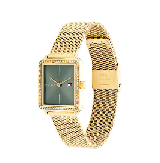 De Tommy Hilfiger Tea is een stijlvol horloge met een goudkleurige roestvrijstalen behuizing van 25 mm en een groene wijzerplaat. Het analoge horloge heeft een quartz uurwerk en mineraalglas. De goudkleurige roestvrijstalen band biedt een comfortabele pasvorm, en het horloge is spatwaterdicht tot 3 bar. Het beschikt over een druksluiting voor gemakkelijke bediening en is perfect voor dagelijks gebruik.