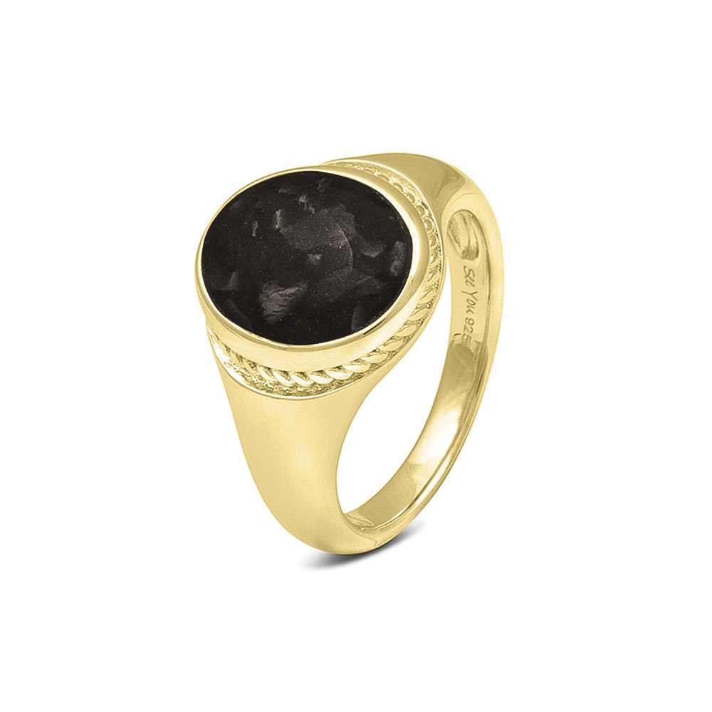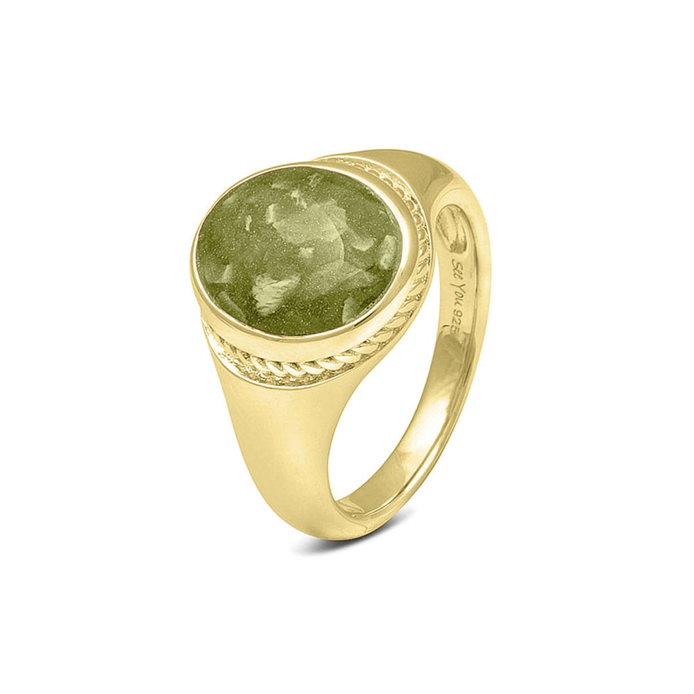 Ovale zegelring. Dit sieraad wordt zichtbaar aan de bovenkant gevuld met as en wordt vermengd met onze speciale hars. Deze ring is ook geschikt om te vullen met haar of een vingerafdruk. Bij een vingerafdruk kunt u er nog aan denken om de verdiept liggende afdruk nog op te vullen met hars. Dit geeft een heel mooi effect.